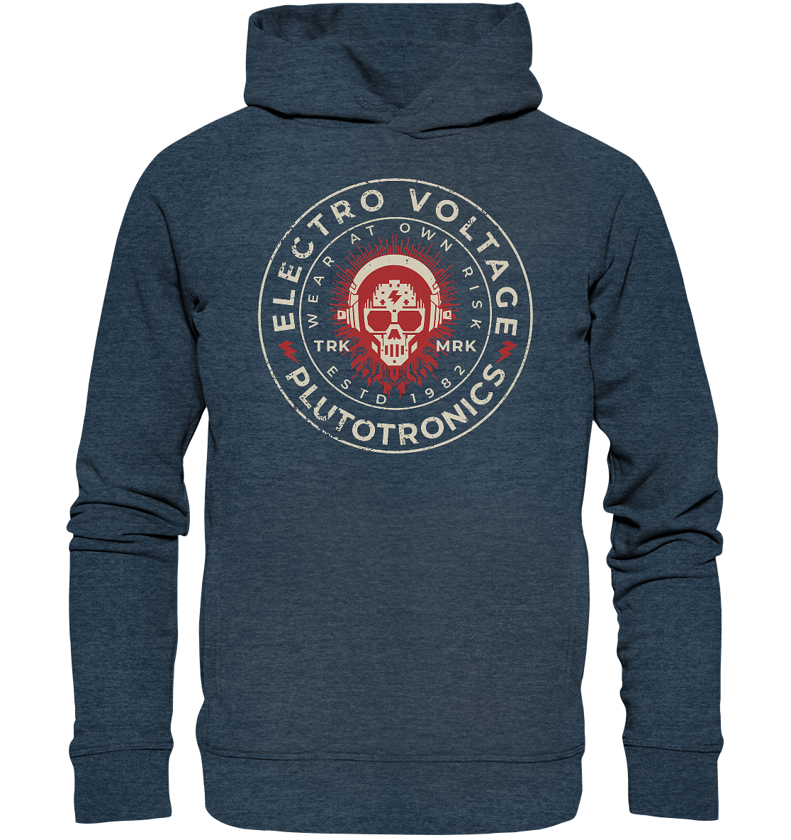 „ELECTRO VOLTAGE Cicular“ in zweifarbigem Setup ist wie ein Beat mit Überladung. Die roten Platinenlinien wirken wie Soundströme, die den Androiden-Schädel aufladen – visuell und symbolisch. „WEAR AT OWN RISK“ ist kein Witz, sondern ein Augenzwinkern für Artists, die mit jedem Track Spannung erzeugen.